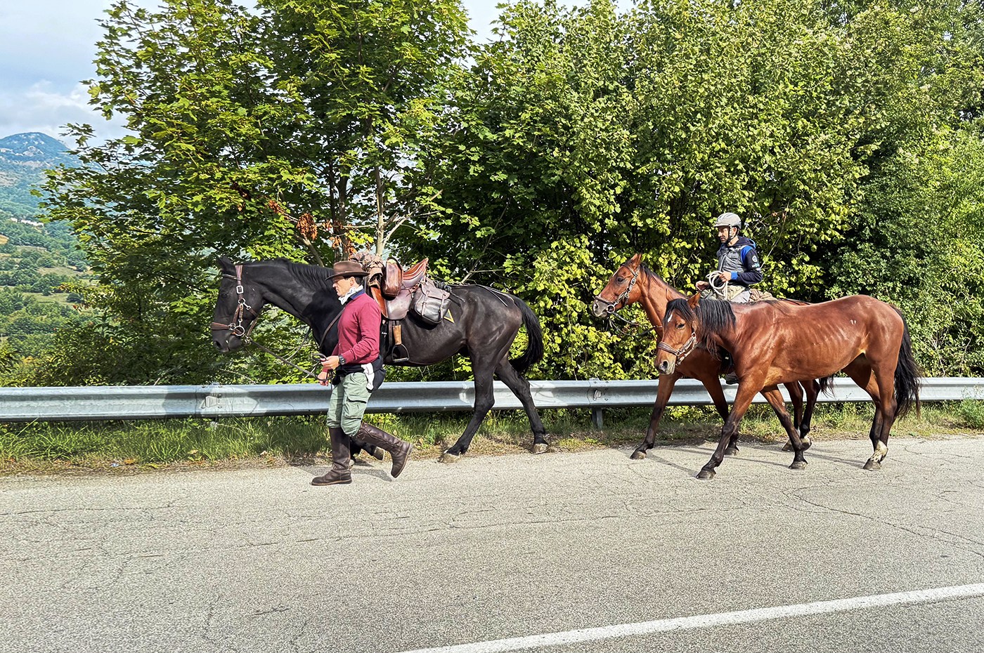 Ho avuto la fortuna di accompagnarli per un tratto di strada. Con loro c’erano i cavalieri Fabio, Gianmarco e Claudio, compagni di viaggio silenziosi e determinati. Abbiamo percorso insieme qualche chilometro lungo i sentieri di montagna, immersi in un’atmosfera quasi sospesa, dove il tempo sembrava rallentare e il passato equestre di queste terre tornava a farsi sentire.