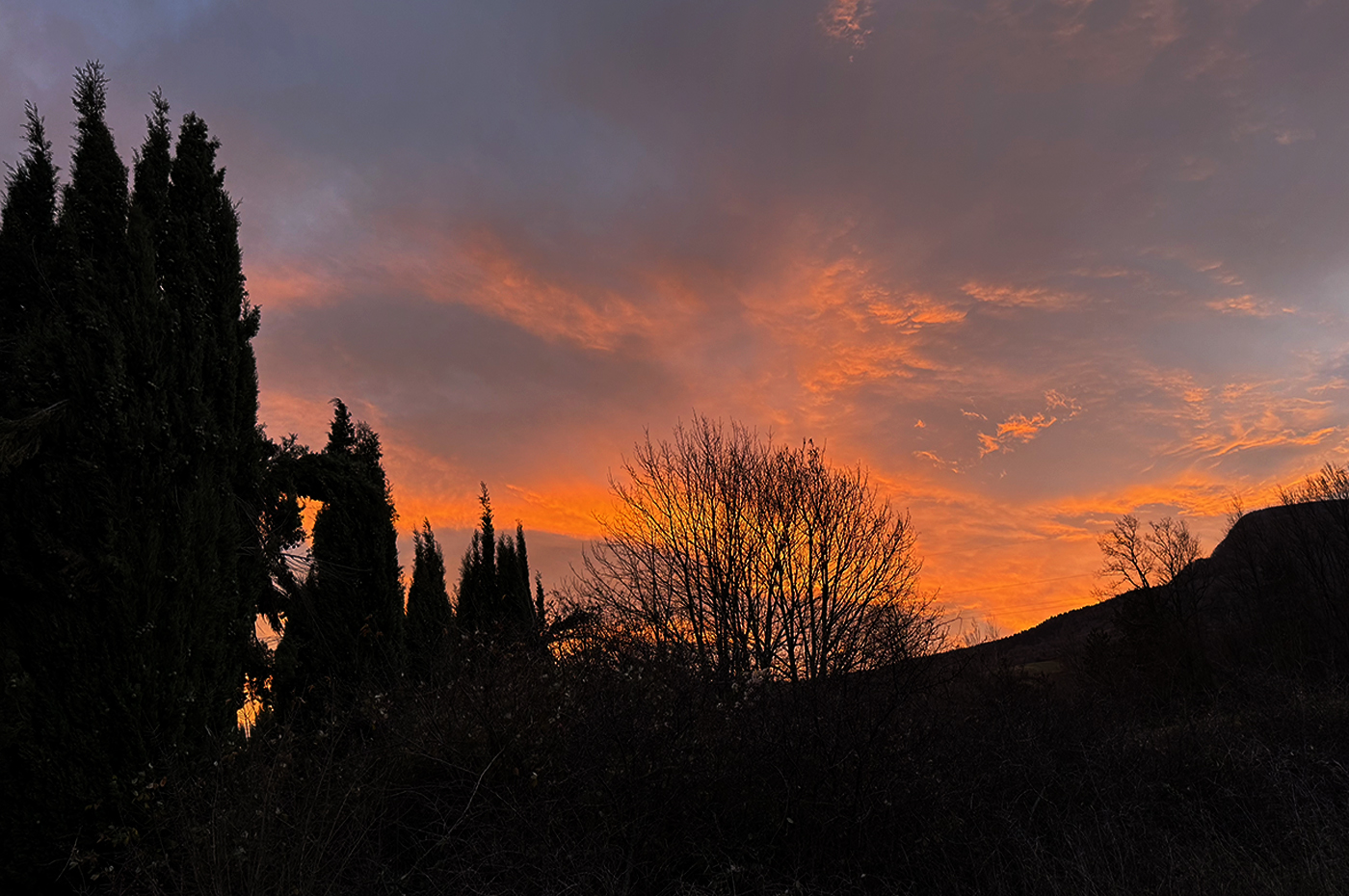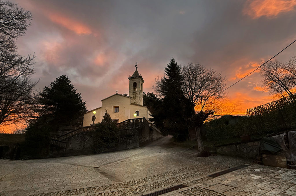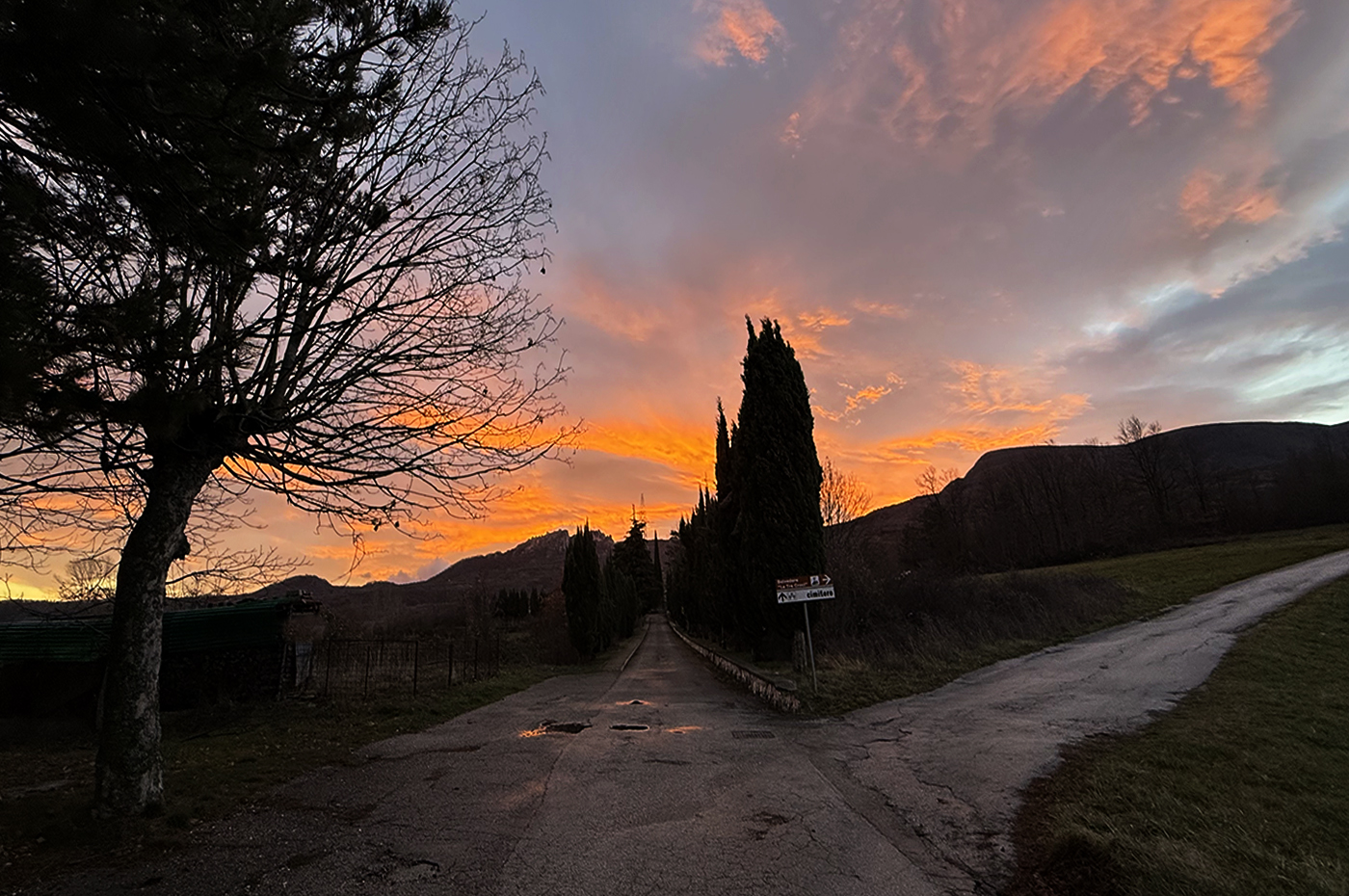 L’alba a Sant’Angelo non arriva mai di colpo. Avanza piano, come un respiro trattenuto troppo a lungo, scivola sulla strada ancora umida e si insinua tra i cipressi scuri, tra i rami nudi che custodiscono il freddo della notte per un ultimo istante silenzioso. Poi il cielo si apre, si colora di arancio e di rosa, come un presepe che si accende senza rumore.