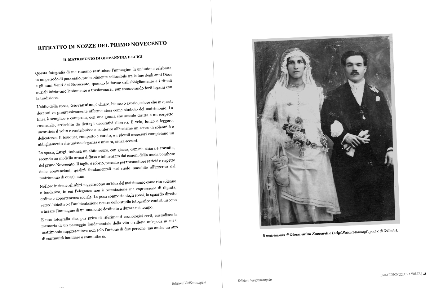 Lโ€™immagine di copertina di questo volume ci riporta al 1895. La fotografia, proveniente da un prezioso album di famiglia e oggi parte dellโ€™archivio storico, culturale e fotografico di ViviSantangelo, si offre come una finestra aperta su un matrimonio di fine Ottocento. Uno scatto che, nella sua apparente semplicitร , racchiude una straordinaria ricchezza di informazioni sulla cultura materiale e simbolica dellโ€™epoca.